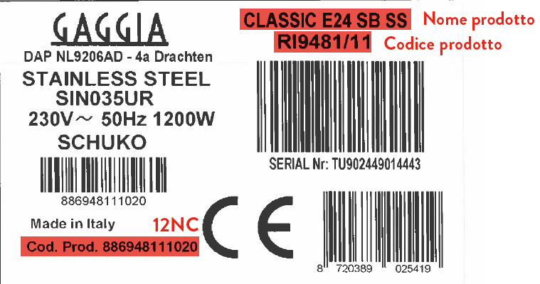 Digita il codice alfanumerico che trovi sull’etichetta prodotto (es. RI9480, EG2111, ...), il codice 12NC (composto da 12 cifre) o il nome del prodotto (es. Classic, Accademia, ...) per scaricare: manuale utente, norme di sicurezza, garanzia, e quick start guide (ove presenti).