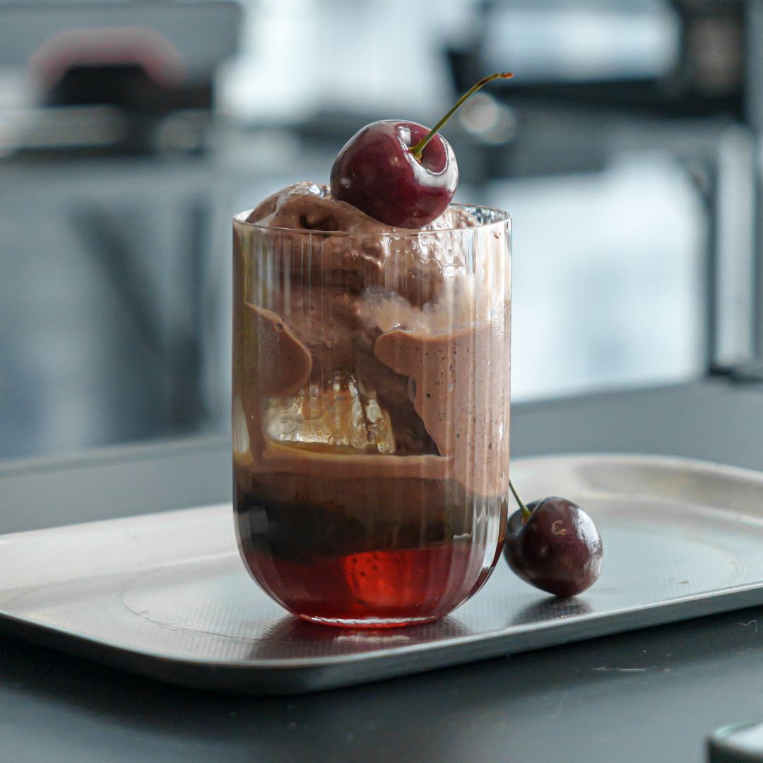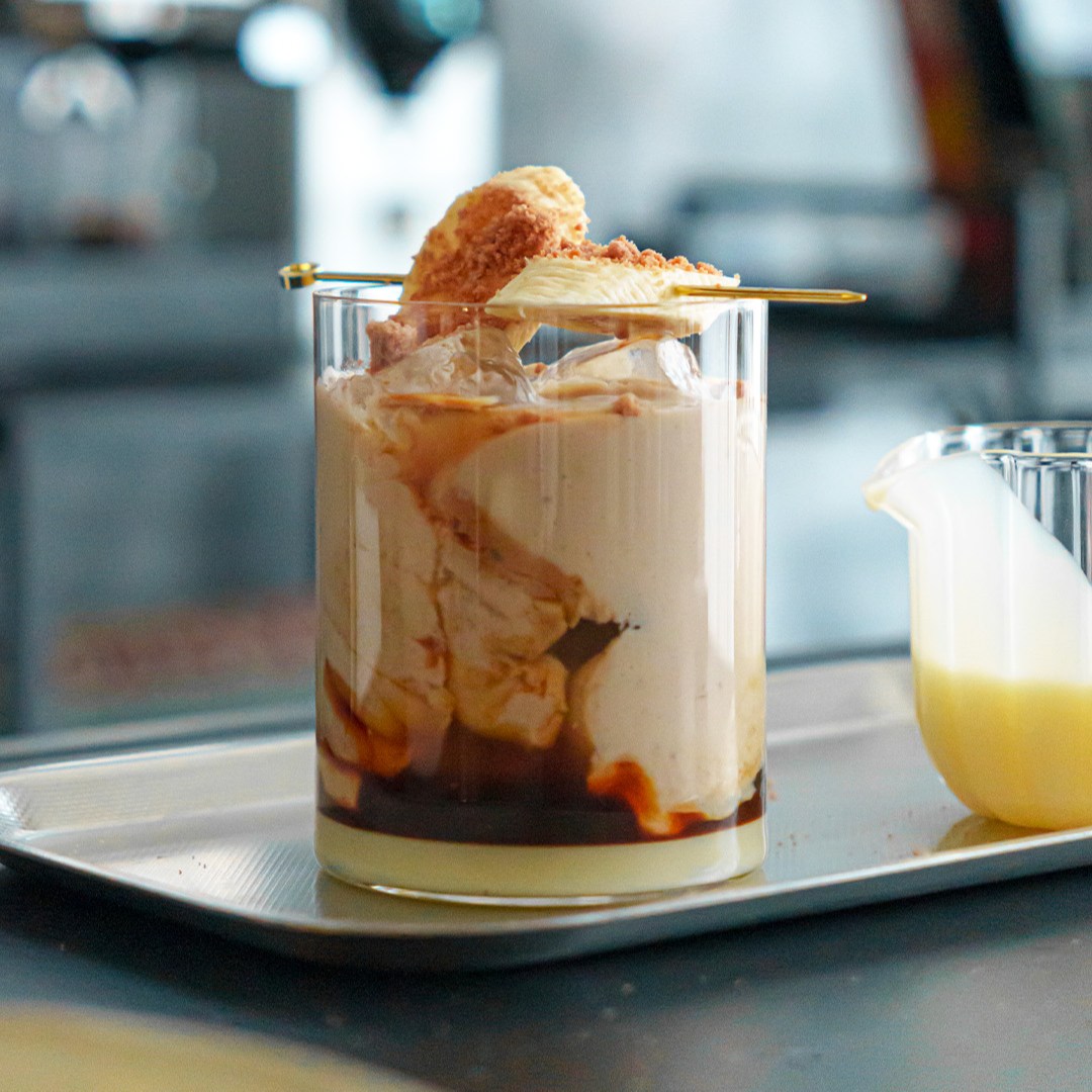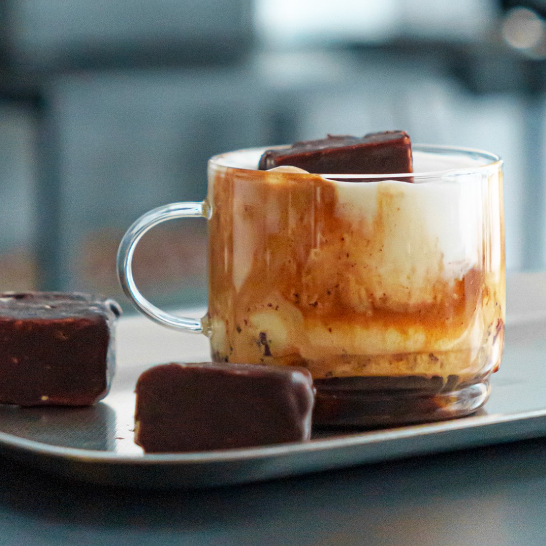 Questa ricetta rompe le regole con consapevolezza: al posto della solita pallina di gelato, abbiamo scelto barrette di gelato ricoperto. Il contrasto tra la consistenza del gelato e il calore dell’espresso appena estratto è amplificato da una nuvola di panna di cocco montata, che aggiunge una nota tropicale inaspettata.