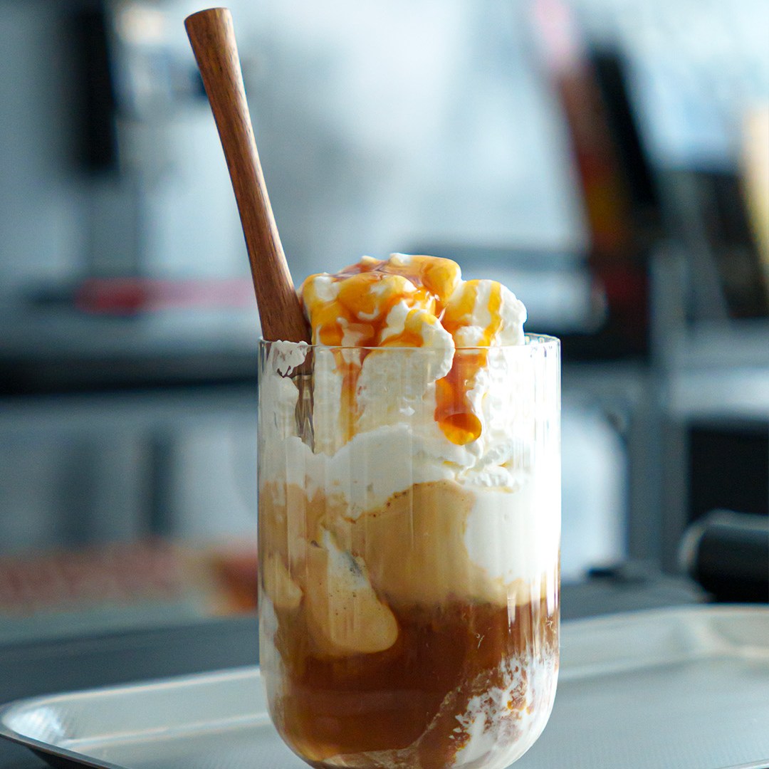 Ci definiamo grandi fan dell’affogato, ma ancora una volta a modo nostro. Qui, vincono i contrasti: il caldo dell’espresso appena fatto si mescola con il freddo del gelato alla vaniglia, la dolcezza della panna montata incontra lo sciroppo al caramello salato. Per chi non sa decidersi.