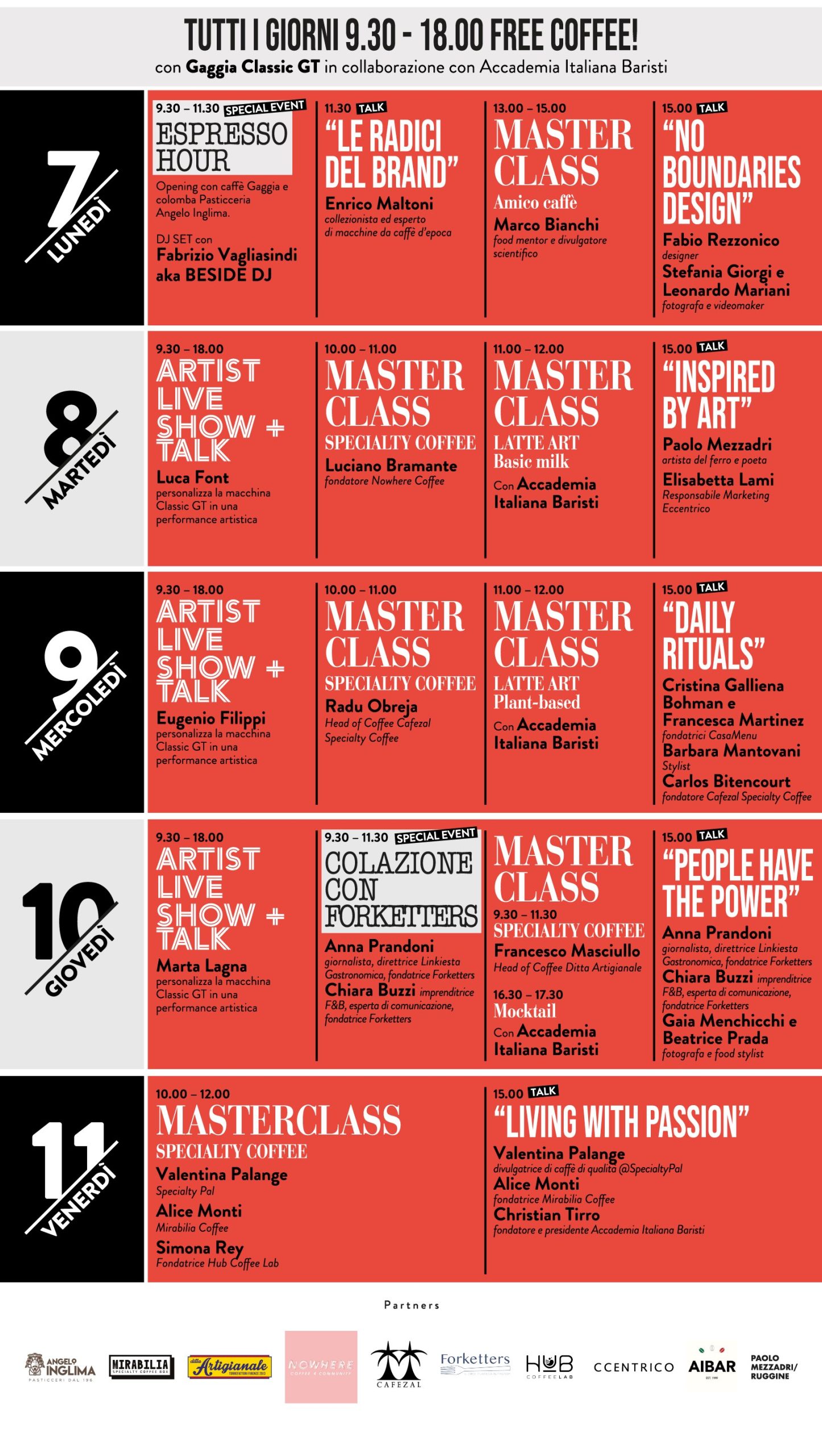 - Talk Gaggia (ogni pomeriggio, dalle ore 15): un salotto informale dove esperti di caffè, arte e design condivideranno le loro esperienze, storie ed opinioni