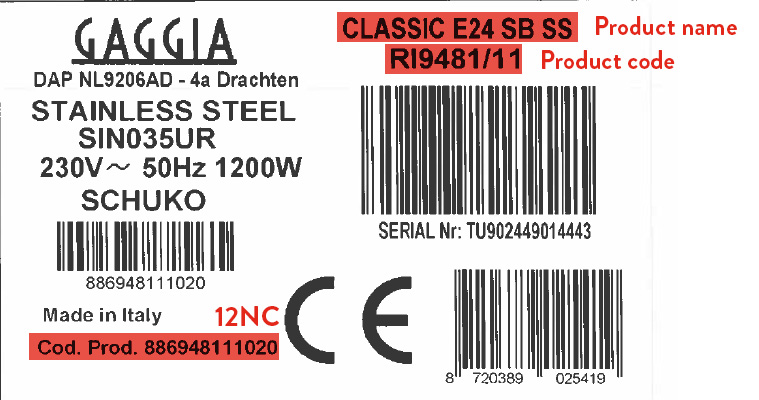 Type the alphanumeric code you can find on the product label (e.g. RI9480, EG2111, ...) or the 12NC code (made up of 12 digits) or the product name (e.g. Classic, Accademia, ...) to download: user manual, safety norms, warranty, and quick start guide (if present).
